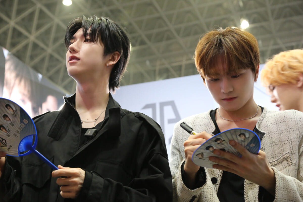 既に人だかりができていたブースに、LIM JIMIN、GEONU、Bain、JM、DYが登場すると来場客から黄色い歓声が。ブース内のパネルにサインをする際には、GEONUが今回参加できなかったSANGWOOのメッセージを見せるなど粋な計らいを見せた。